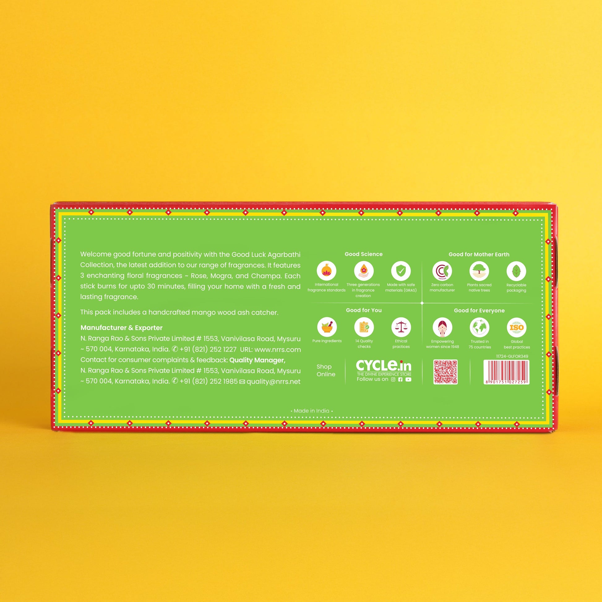 Welcome good fortune and positivity with the Good Luck Rose Agarbathi, the latest addition to our range of fragrances. It features 3 enchanting floral fragrances ~ Rose, Mogra, and Champa. Each stick burns for up to 30 minutes, filling your home with a fresh and lasting fragrance.