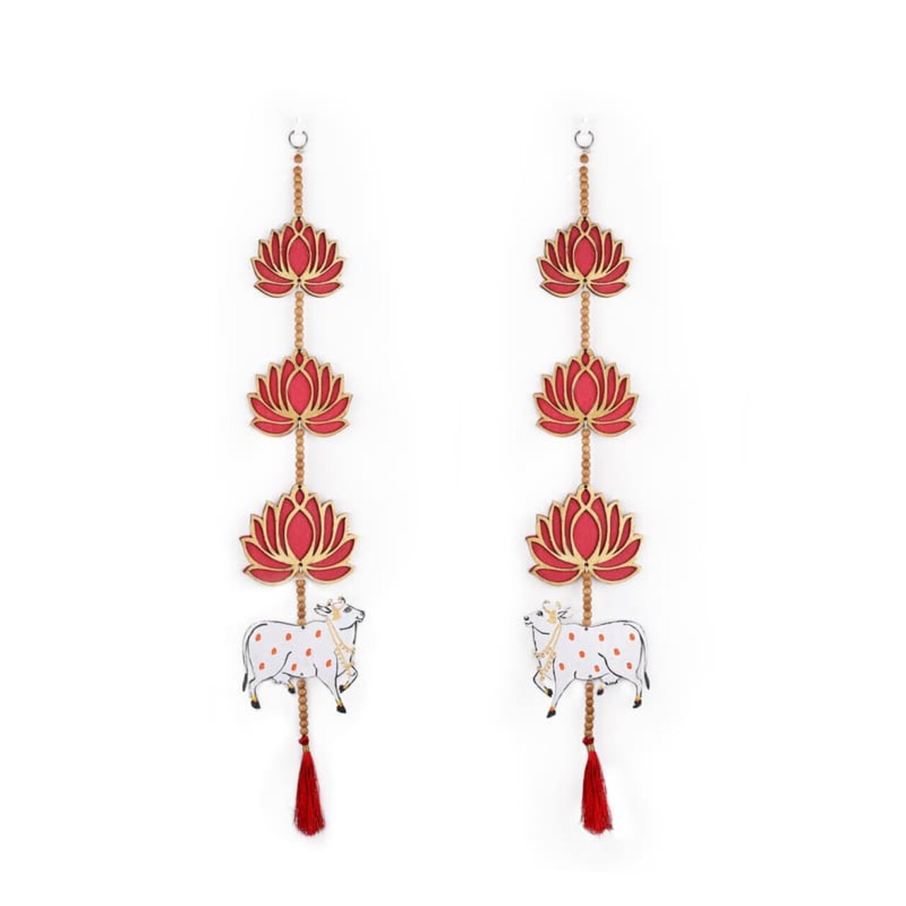 This handcrafted wooden Lotus and Cow Thoranam is an artistic home decor pair that features a beautifully crafted lotus and a cow on each of the units and 'Shubh' and 'Labh' on either unit, representing purity, prosperity, and sacredness.