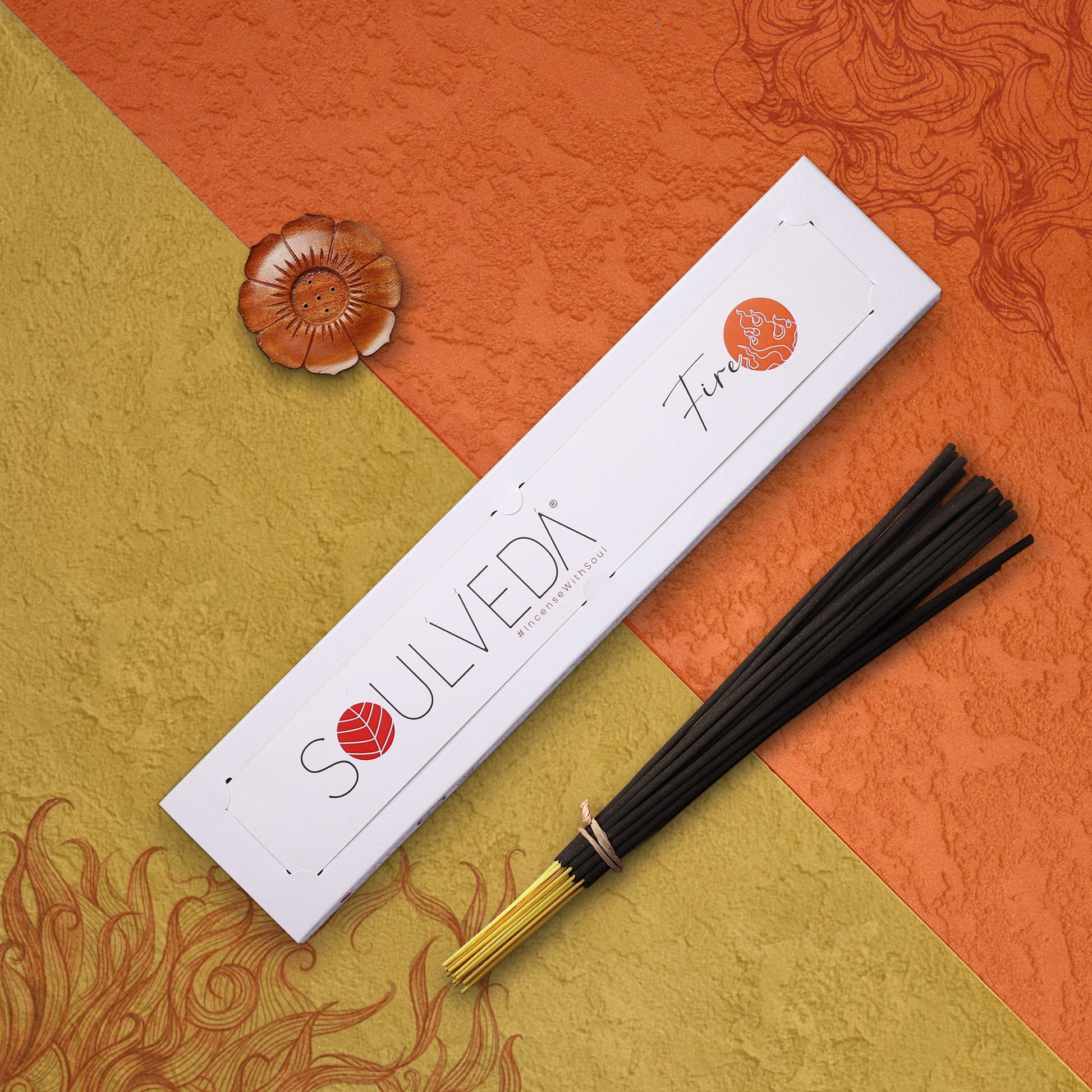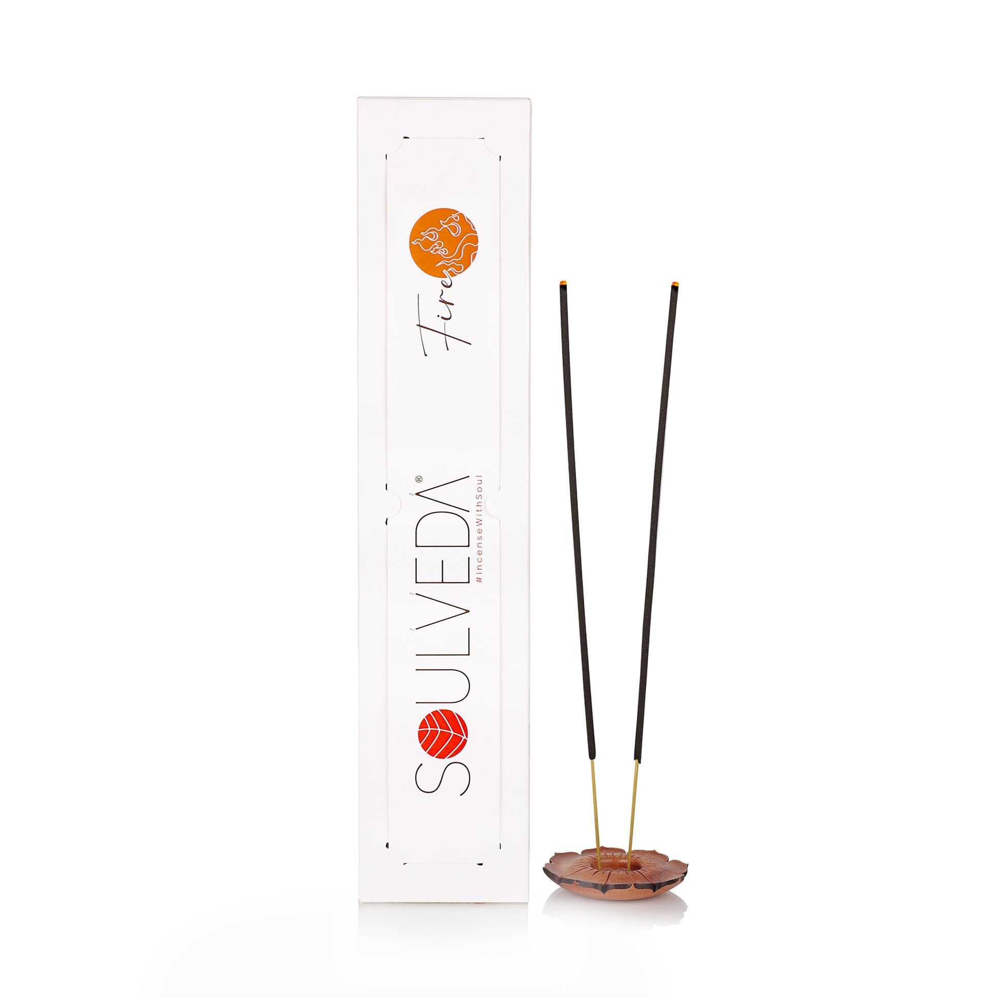 Handcrafted with 100% pure ingredients, SOULVEDA FIRE is created with a special blend of sandal and cinnamon fragrances. Characteristic of the fire element, the woody-spicy notes of sandal and cinnamon spread long-lasting warmth and positivity in your puja room/prayer space.