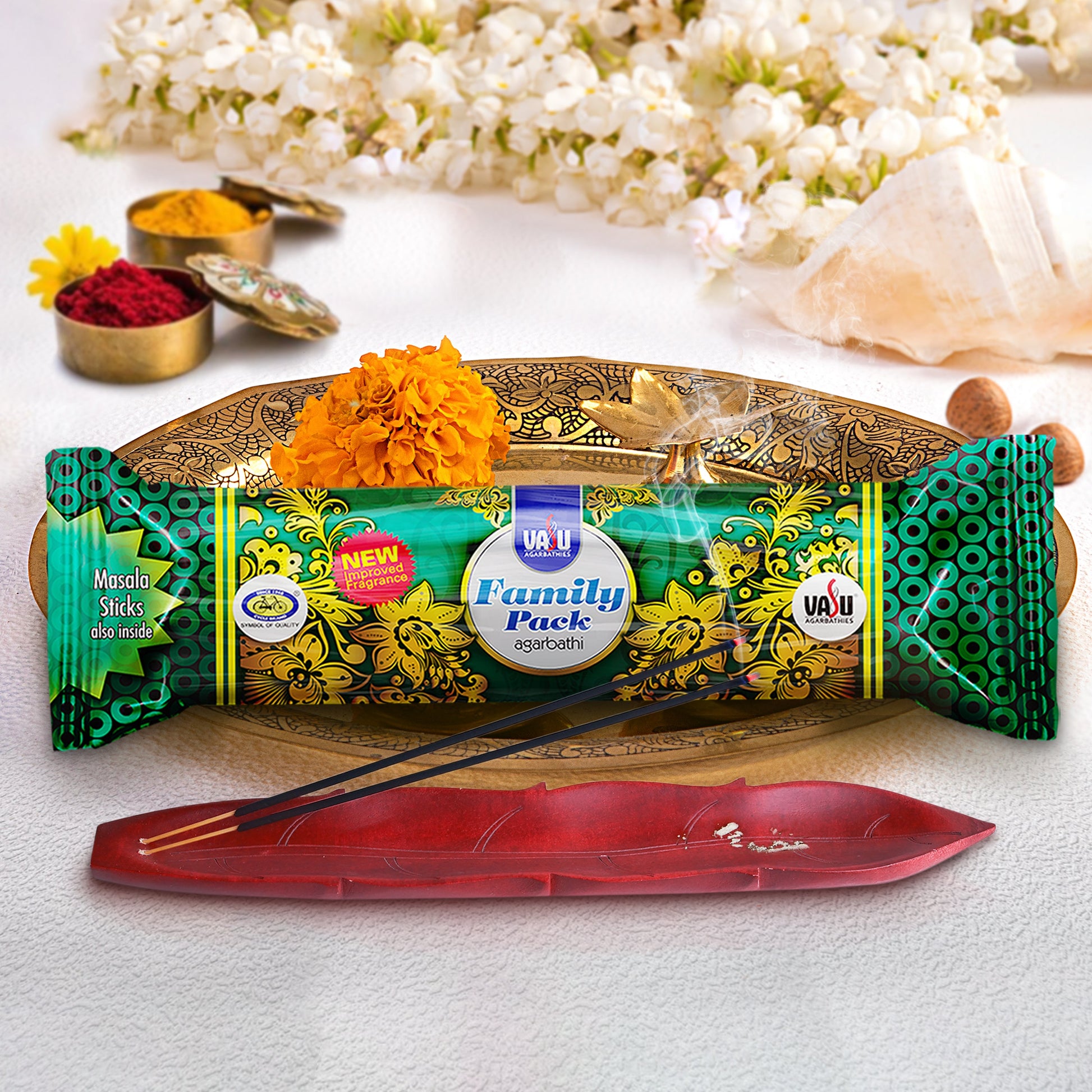 Vasu Family Pack Agarbatti is a set of three fragrances – Kumkum, Kasturi Tulsi and Manjal.