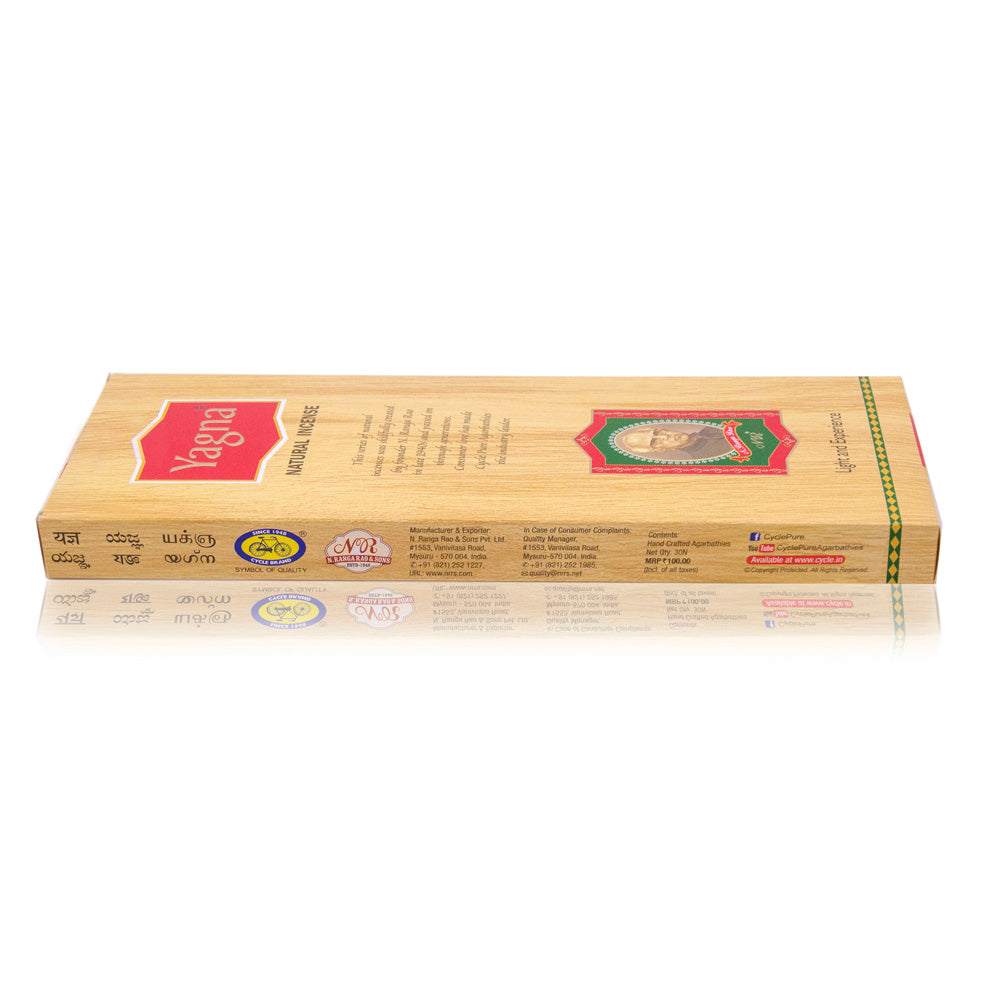 Yagna Agarbatti, a premium pack of agarbathies is a unique formulation created by our visionary founder in late 1940s and handed down through generations. 'Yagna' refers to any ritual performed in front of Agni or sacred fire, often by chanting mantras. Yagna Agarbathies is an aromatic amalgamation of all natural and pure ingredients offered to Agnidev while performing this divine prayer.